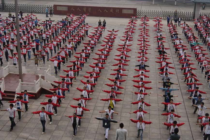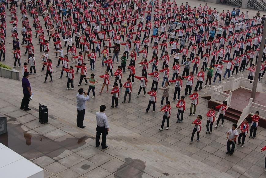 据悉,该活动在全校48个教学班和全体体育教师中展开,参与人数2000多人,是沁园中学参与人数多,规模大,普及面较广的一次活动。先由体育教师带领班级在体育课上学习,然后,在上午课间操以班级为单位,由班主任老师组织学生集体操练。最后,由学校办公室监督在升旗广场整体演练。演练场面气势壮观,不断引来过往行人驻足欣赏。