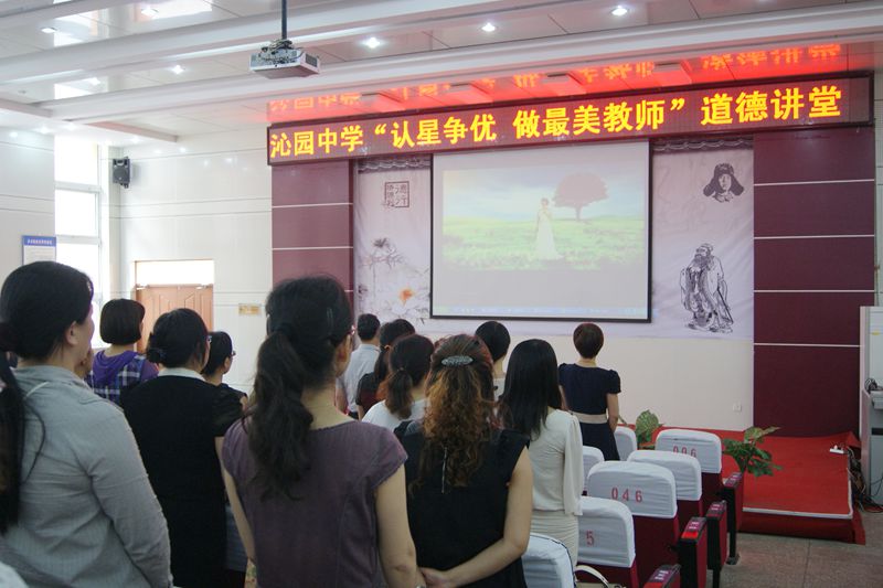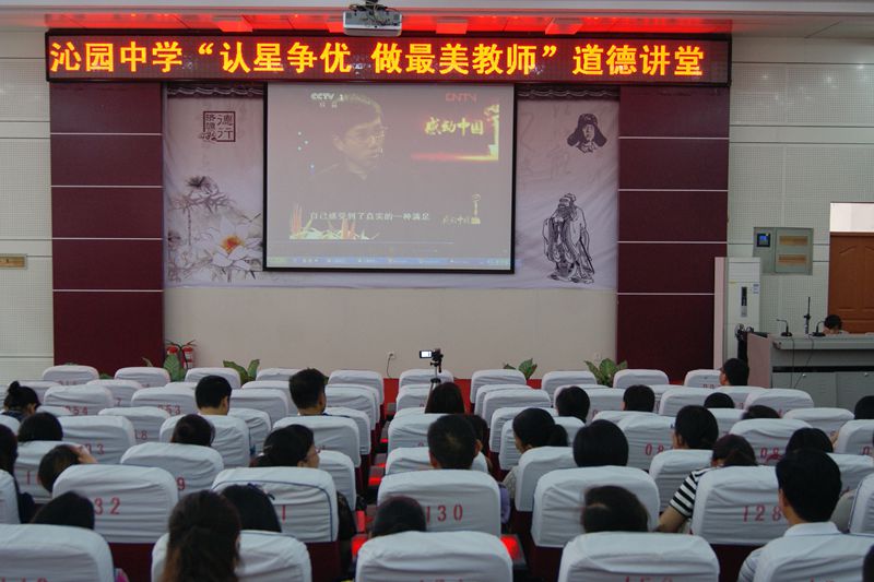 为全面践行社会主义核心价值观,引导广大教师以星级标准规范日常工作、生活言行,用真情去发现“美”,分享“美”,弘扬“美”,着力构建和谐美丽幸福的新沁中,济源市沁园中学在大力开展“认星争优,做最美教师”活动之际,举行了以“认星争优,做最美教师”为主题的教师道德讲堂。道德讲堂开始前,大家纷纷闭上眼睛,对照自己以往的言行进行了一分钟反省,接着在集体学唱《教师之歌》中拉开了序幕。在“讲故事、看短片、做点评”环节,该校翟静华、霍小雪、罗田三位优秀教师代表用平实的语言真情地讲述了自己争做最美教师的故事,紧接着大家观看了感人至深的短片《感动中国年度人物胡忠和谢晓君夫妇的感人事迹》,在场的每一位教师无不被三位优秀教师的平凡事迹和胡忠、谢晓君夫妇坚守高原无私奉献的精神所深深打动,也深刻地领悟到了“最美”的涵义,懂得了“什么叫忠诚党的教育事业,什么才是恪守教师职业道德”。部分教师在看完短片后,发表了自己的感悟、感想,表示将以实际行动不断树立学高身正、受人尊敬的师表形象,争做最美教师,为创办人民满意的教育做出更大的贡献。随后,广大教师纷纷起立,举起右手作出了郑重承诺:倡导真善美,弘扬新风尚,为每一个学生的美好未来和幸福人生,奉献自己全部智慧和力量。活动结束前,主持人代表学校也向与会教师送上了吉祥的祝福,希望广大教师能用强烈的责任感凝聚起实现中华民族伟大复兴的中国梦所需要的正能量,用爱国爱教育爱家爱学生的大爱之心演绎争做最美教师的精彩乐章。