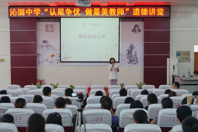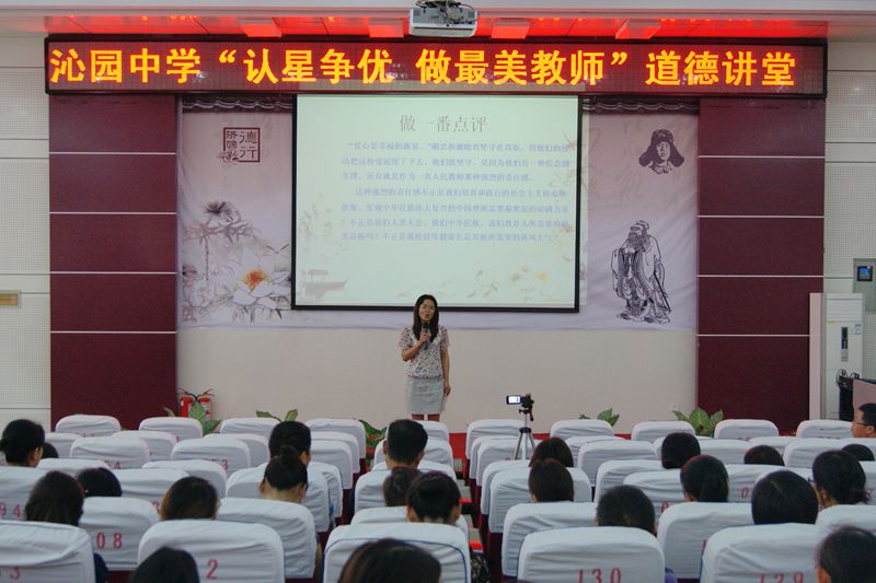 近日,济源市沁园中学在学校多功能报告厅举行了“认星争优,做最美教师”道德讲堂。广大教师在做反省、学唱歌、讲故事、看短片、做点评、作承诺、送吉祥等七个环节中接受了道德的洗礼,品悟了道德力量,升华了自身境界。